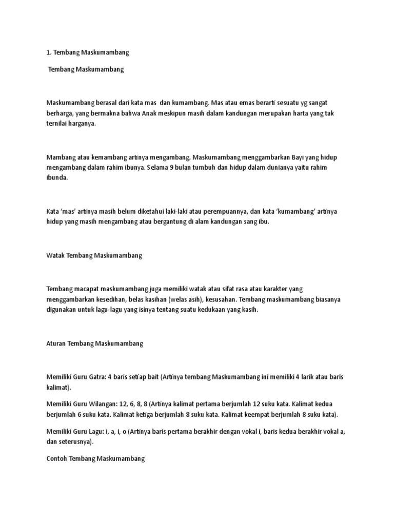 ( u, a, i, a) artinya adalah di barisan yang pertama tembang ini . 'bapak pucung' merupakan salah satu contoh tembang macapat pocung atau pucung yang berasal dari jawa. Paugeran, dan contoh tembang pocung. Tembang pocung merupakan salah satu tembang macapat yang menurut urutan tembangnya merupakan tembang terakhir dalam khasanah tembang macapat yang memiliki . Jumlahnya baris setiap bait) berikut ini contoh cara membaca guru wilangan dan guru…